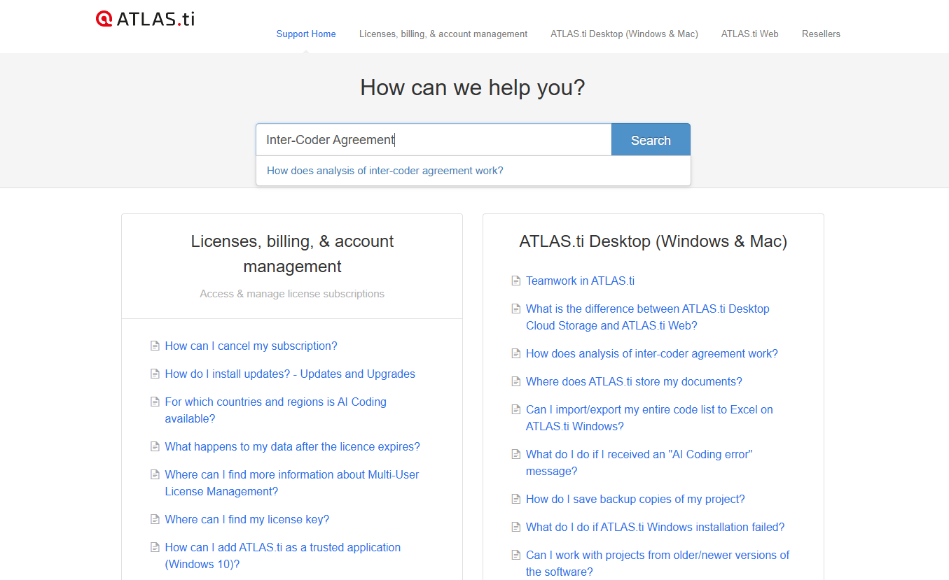 You can also visit our Help Center and FAQ at https://atlastihelp.helpscoutdocs.com. It includes practical support articles on ATLAS.ti Web functionality, subscriptions, account and license management, teamwork features, and troubleshooting. You can search by keyword or browse related articles to quickly find answers while working on your project.