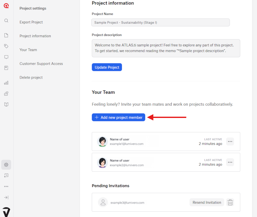 To add team members, open the Project Settings and select “Add new project member.” Each person you invite will need their own ATLAS.ti account to join the project. However, you can still send an invitation even if they don’t have an account yet - they will automatically receive an email with instructions on how to access the project. You can invite as many people as you like, with no limit on team size.