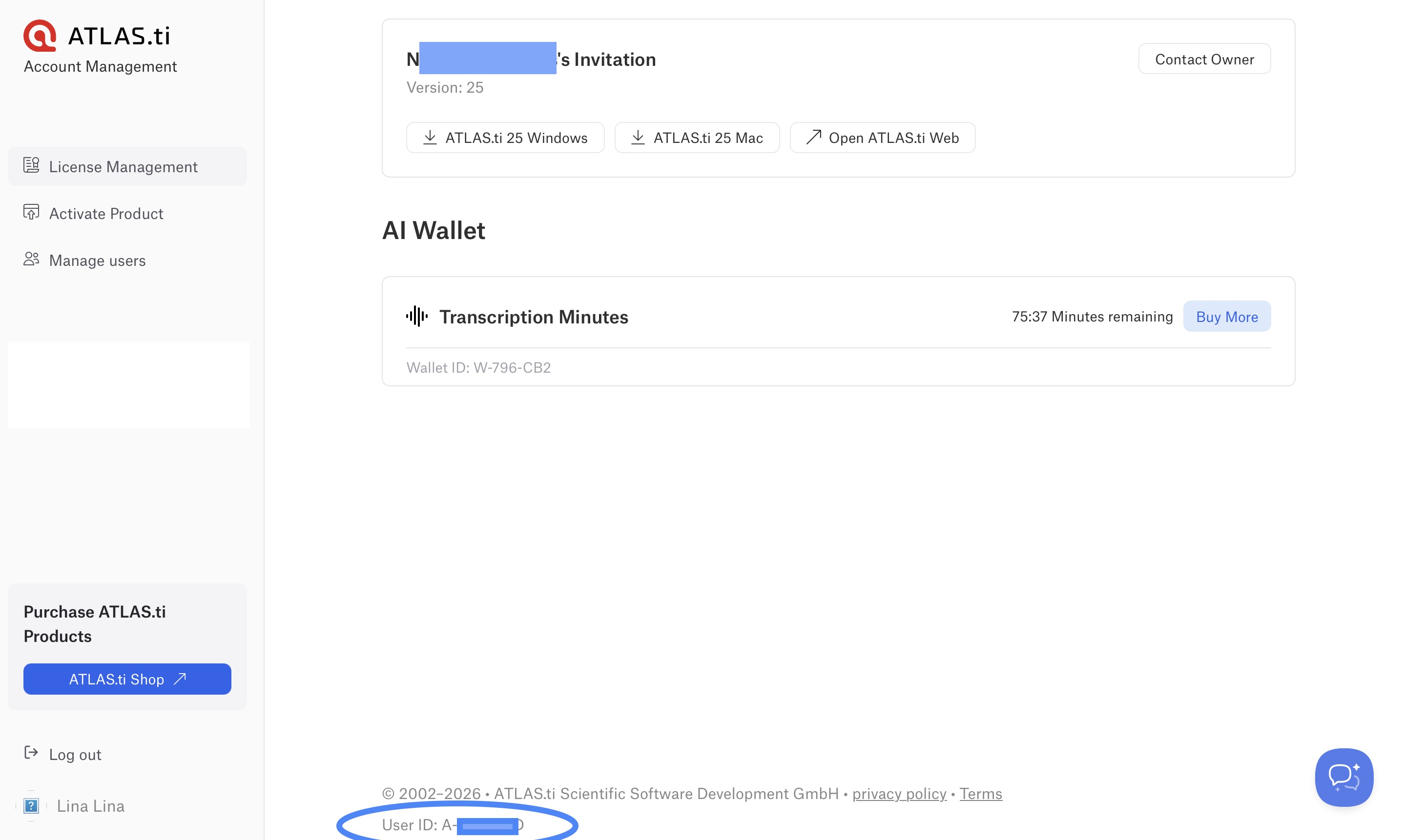Your ATLAS.ti User ID follows the format A-XXX-XXX and always begins with the letter “A”. You can find your User ID by logging in to https://my.atlasti.com/licenses and scrolling to the bottom of the page.