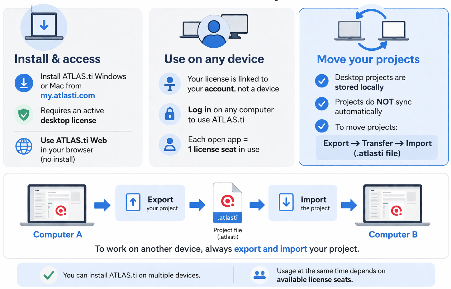 Anyone who wants to install ATLAS.ti on multiple devices, work across different computers, or understand how licenses and projects behave when switching devices.