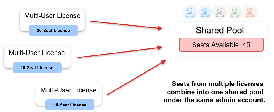 - All licenses activated under the same account are combined into a shared license pool, and the new seats become available immediately without reinviting users.