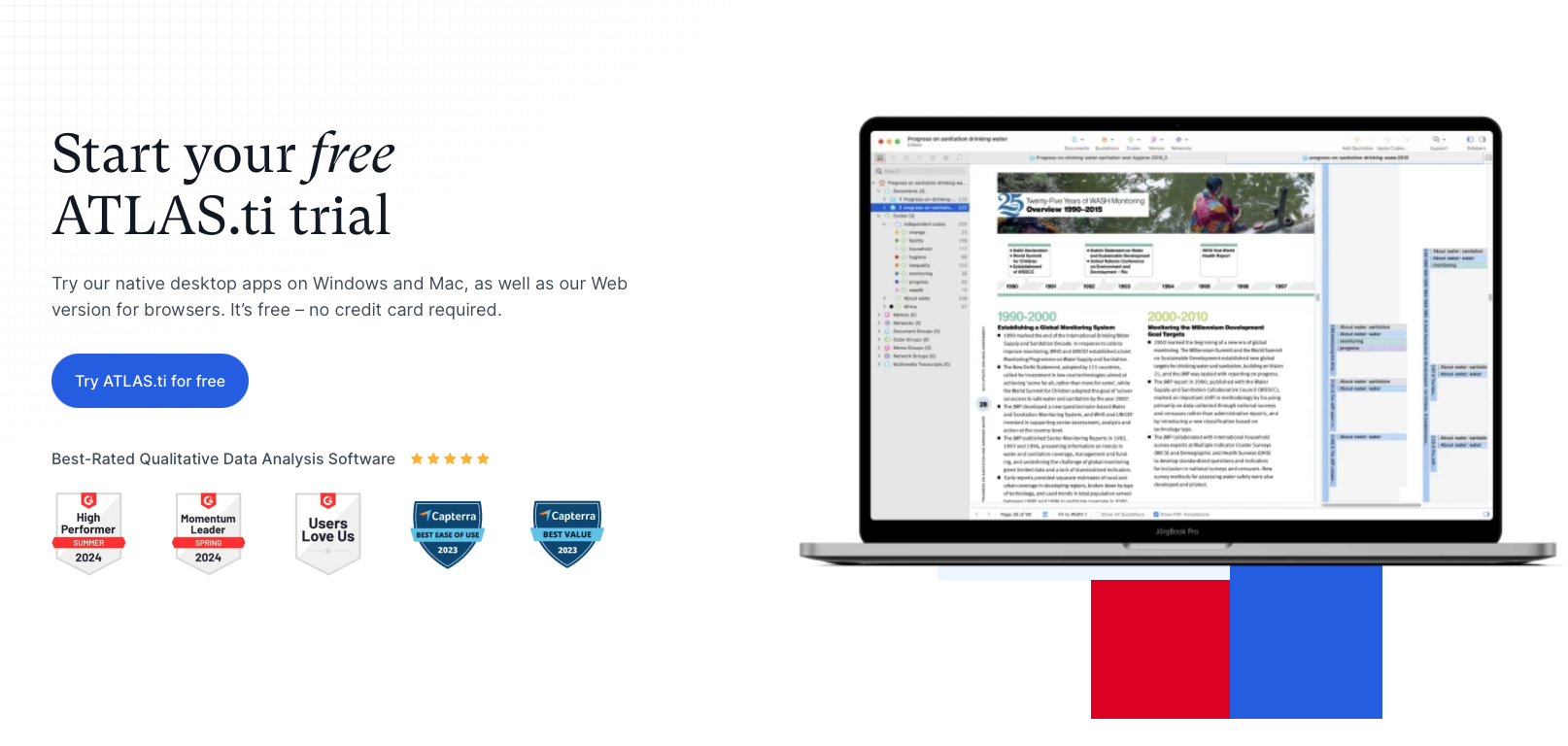 - You can start working with ATLAS.ti right away with a free trial.