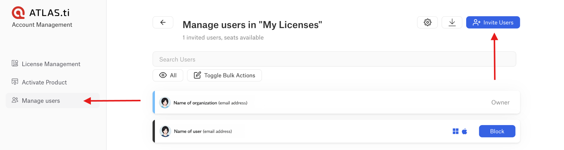 Administrators of ATLAS.ti campus or multi-user licenses: The person who activates the license key, invites others to use the license, and manages license users in the ATLAS.ti account page my.atlasti.com (such as a member of the IT team of your university or the head of a research team)