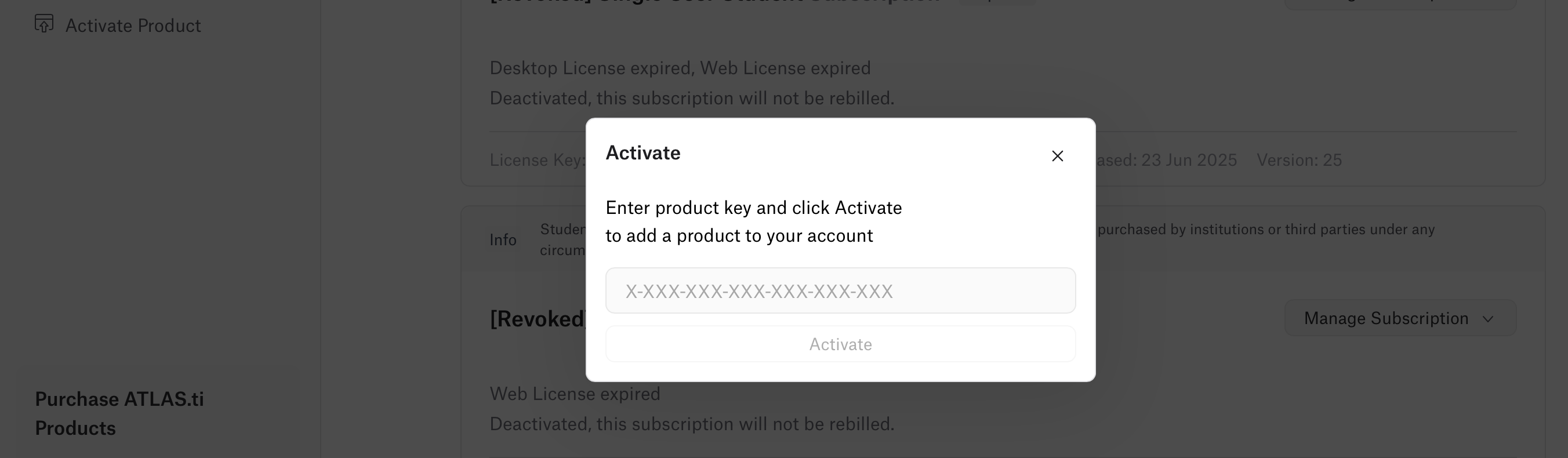 In the Activate Product section, you can activate different types of codes associated with your ATLAS.ti account.