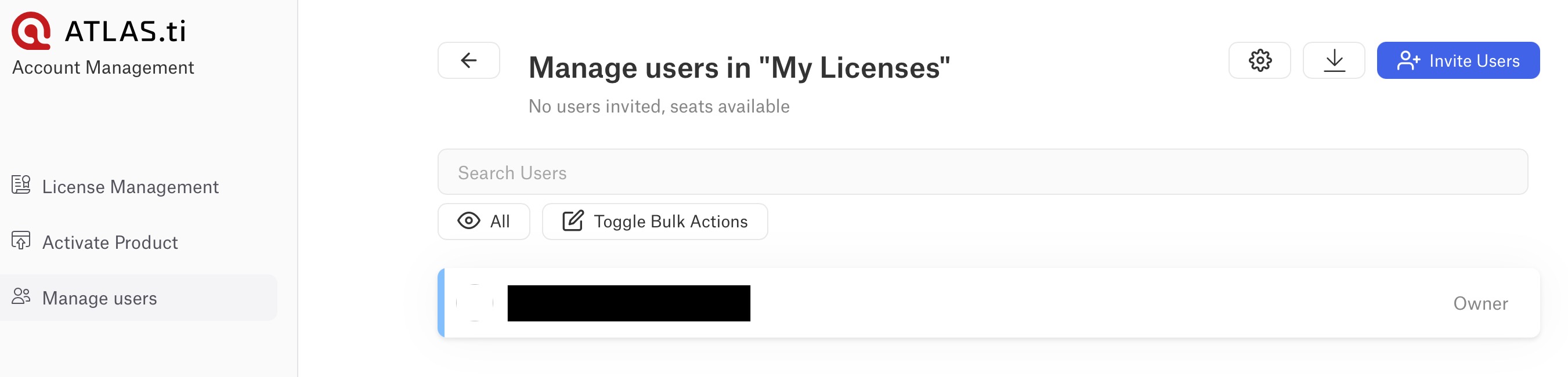 - The Manage Users section is only visible if you are the administrator of a multi-user or campus license. Users who were invited to a license will not see this option.