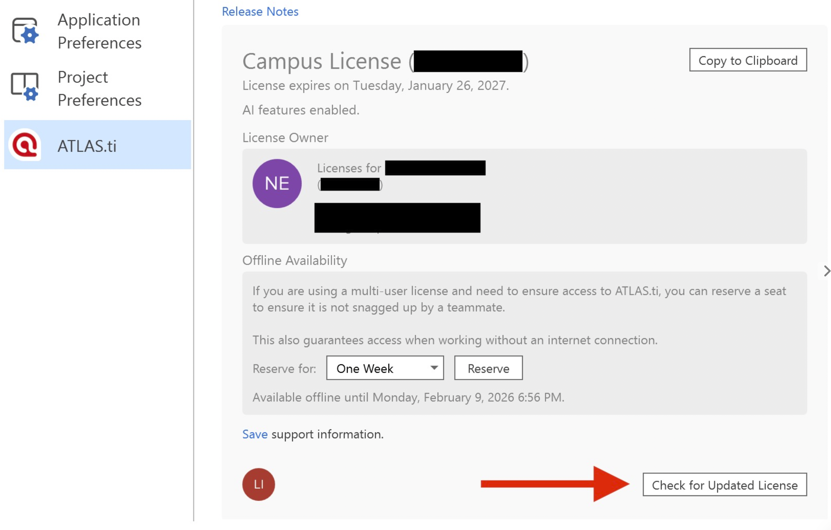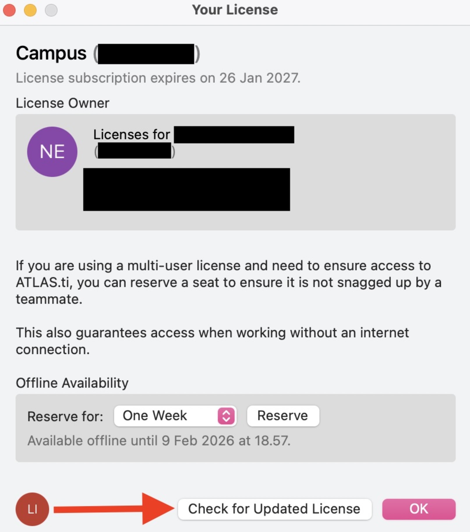 - Mac: ATLAS.ti > License > Check for Updated License