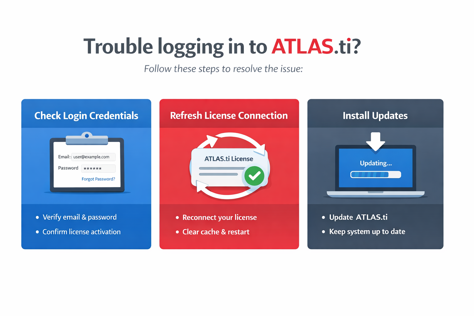 - You are using the correct email address and password associated with your ATLAS.ti account and the activated license.