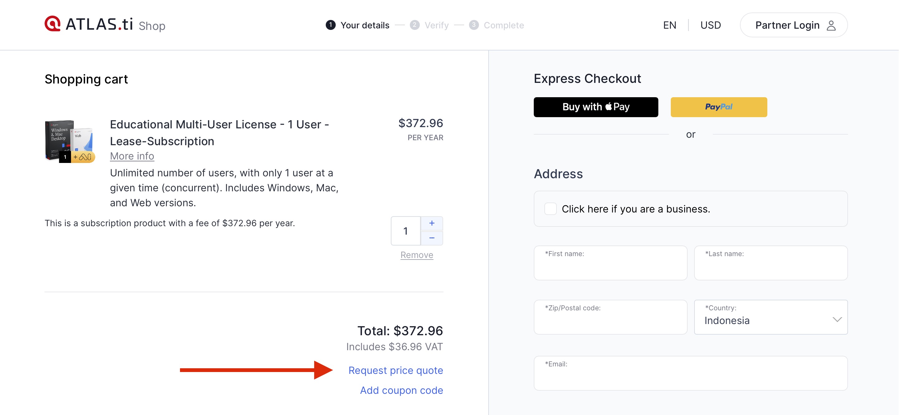 - Go to the ATLAS.ti web shop and create a price quote