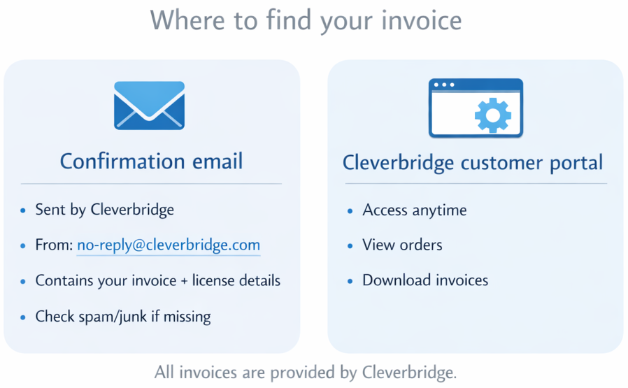- The order confirmation email is sent by Cleverbridge (from no-reply@cleverbridge.com) and includes your license key, purchase details, and invoice.