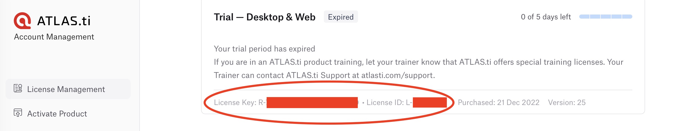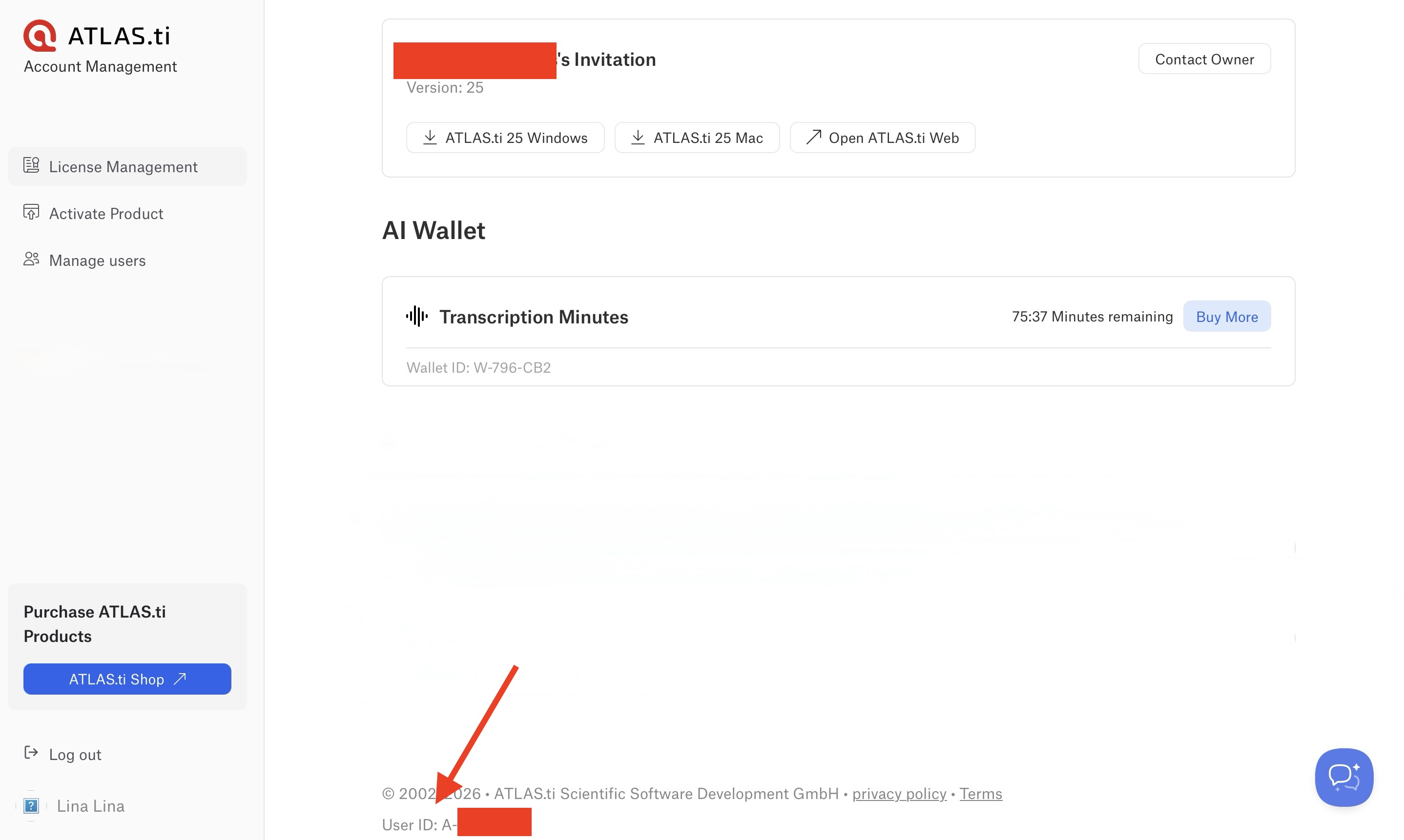 - Your ATLAS.ti User ID (format: A-XXX-XXX). You can find the information on the account page: my.atlasti.com or from inside the apps