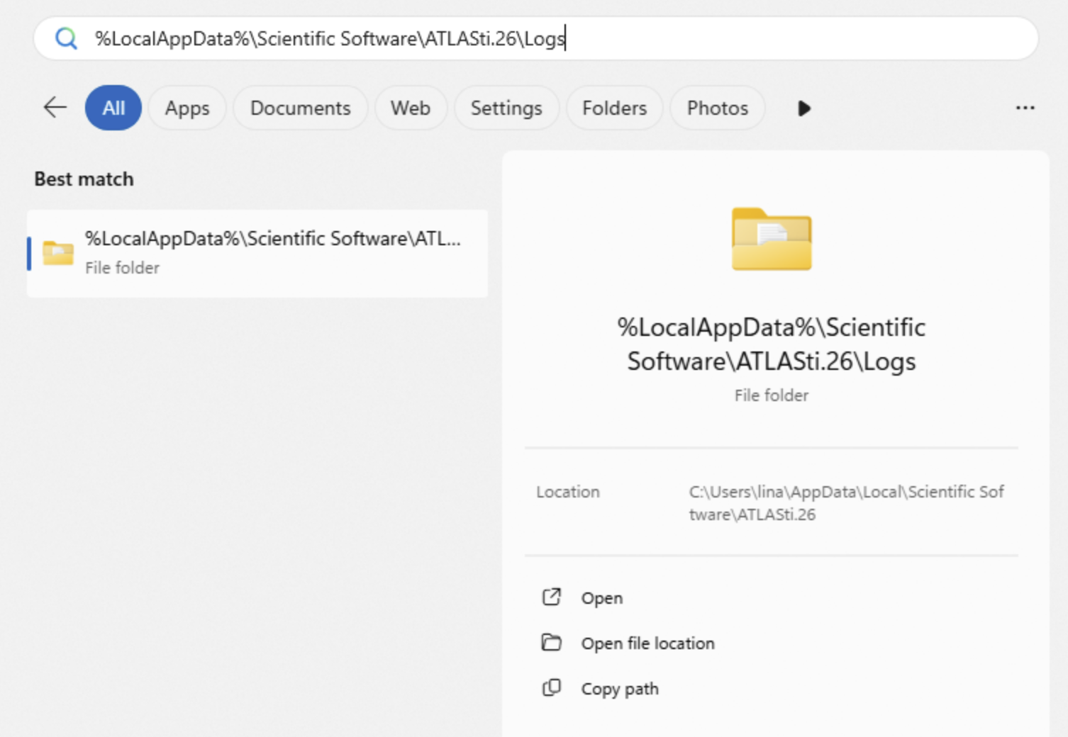 - %LocalAppData%\Scientific Software\ATLASti.26\Logs