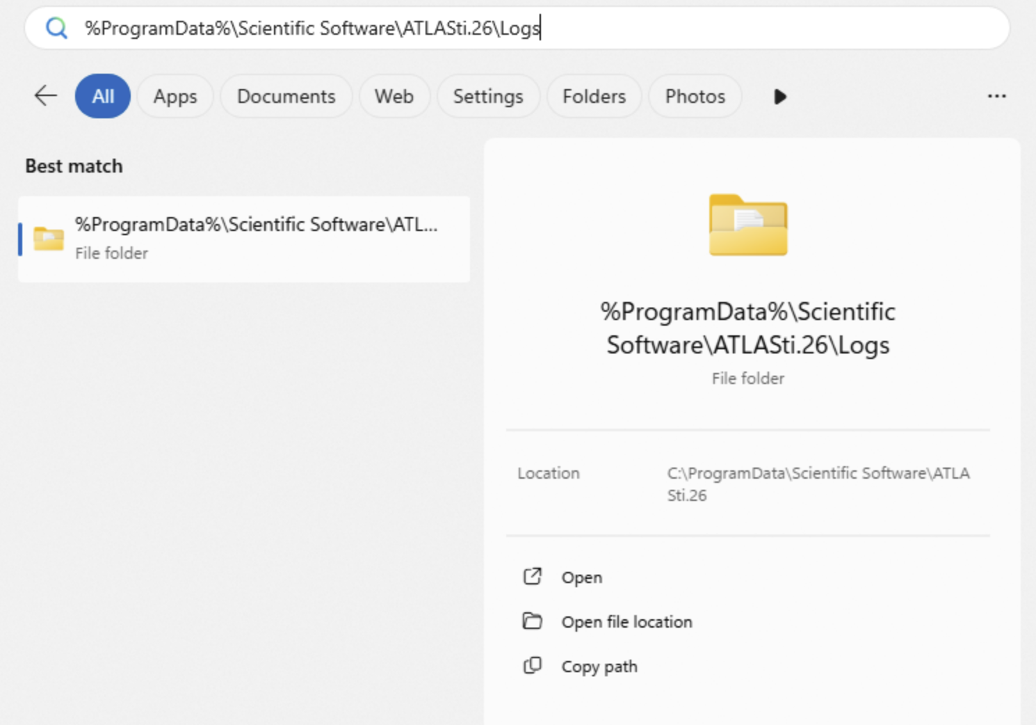 - %ProgramData%\Scientific Software\ATLASti.26\Logs