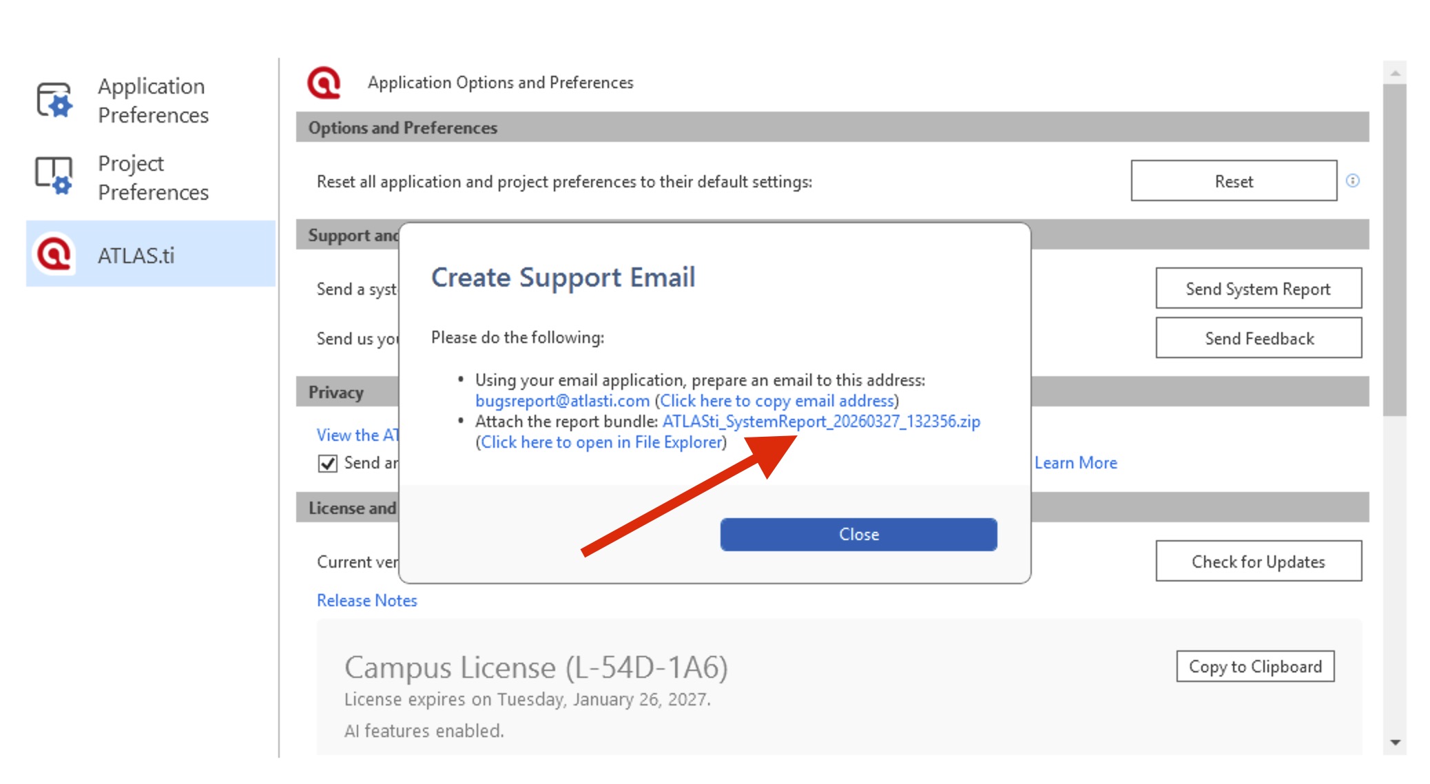 - This will open a pop-up window where you can generate two files: General.atlinfo and Projects.atlinfo. Here is a screenshot of the “Export System Report” option for reference: