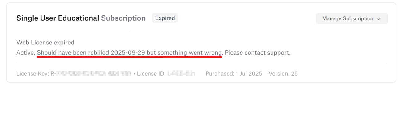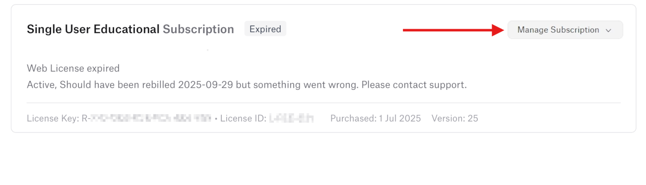 - It may take some time for the system to retry the payment. Wait a short period and check your license again.